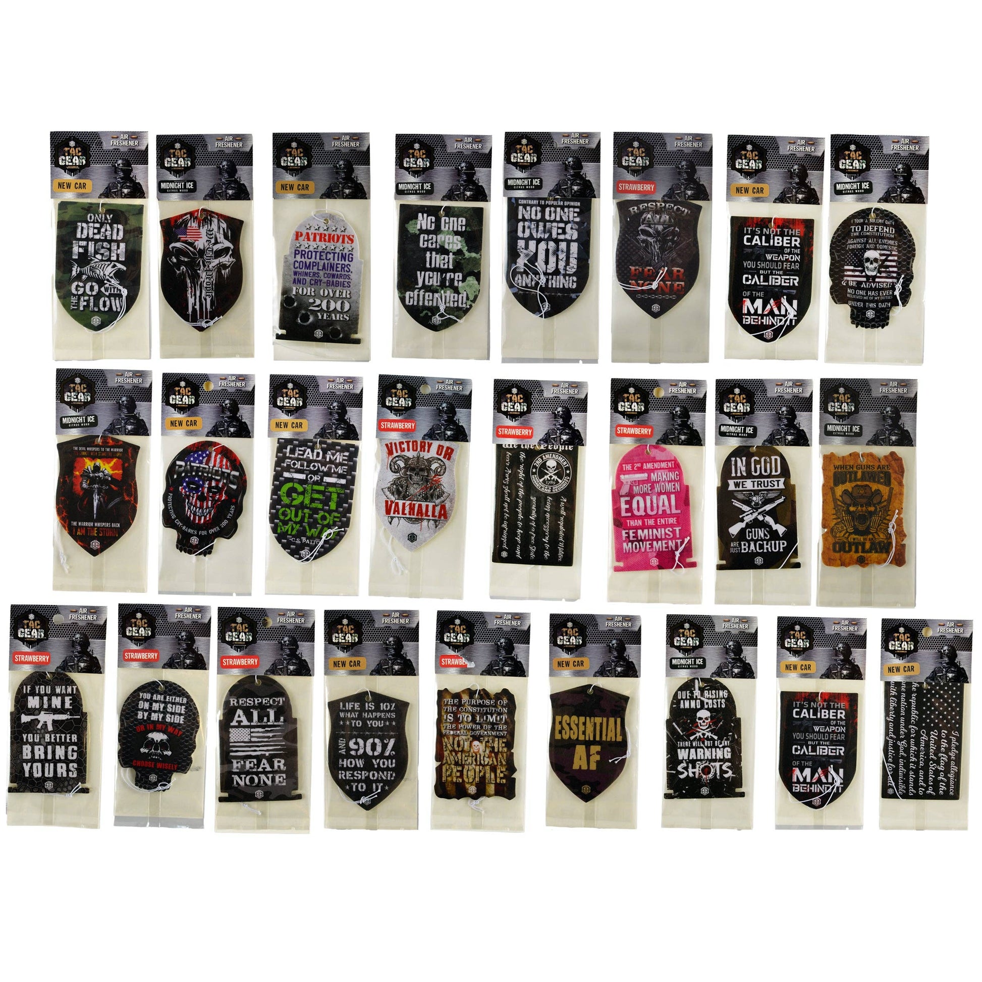 Our Tactical Air Fresheners do MORE than cover odors- they ELIMINATE stinky situations in your car, locker, kitchen, garage, and more! Each display features a variety of witty, trendy and often unapologetic artwork and phrase styles. Enjoy 30 DAYS of freshness! Traps, eliminates, cleans and freshens small spaces