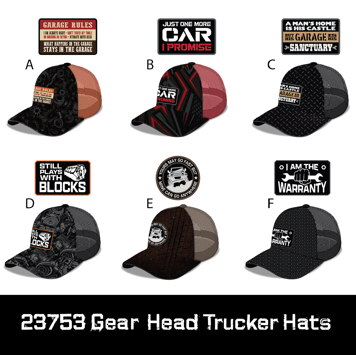 Gear Head Trucker Hats are Built for Life! Great for outdoor activities like fishing, hunting, baseball, mowing, driving and more. Made with heavy duty canvas and breathable mesh. Adjustable fit. Perfect for everyday use! Each display offers a variety of designs. Hang tags included for additional displaying options. EA Dimensions: 7.4W (adjustable)